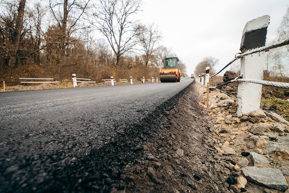 Eine Nahaufnahme einer neu asphaltierten Straße mit einer Dampfwalze in der Ferne. Die Straße ist von weißen Leitplanken gesäumt und von kahlen Bäumen unter einem bedeckten Himmel umgeben.