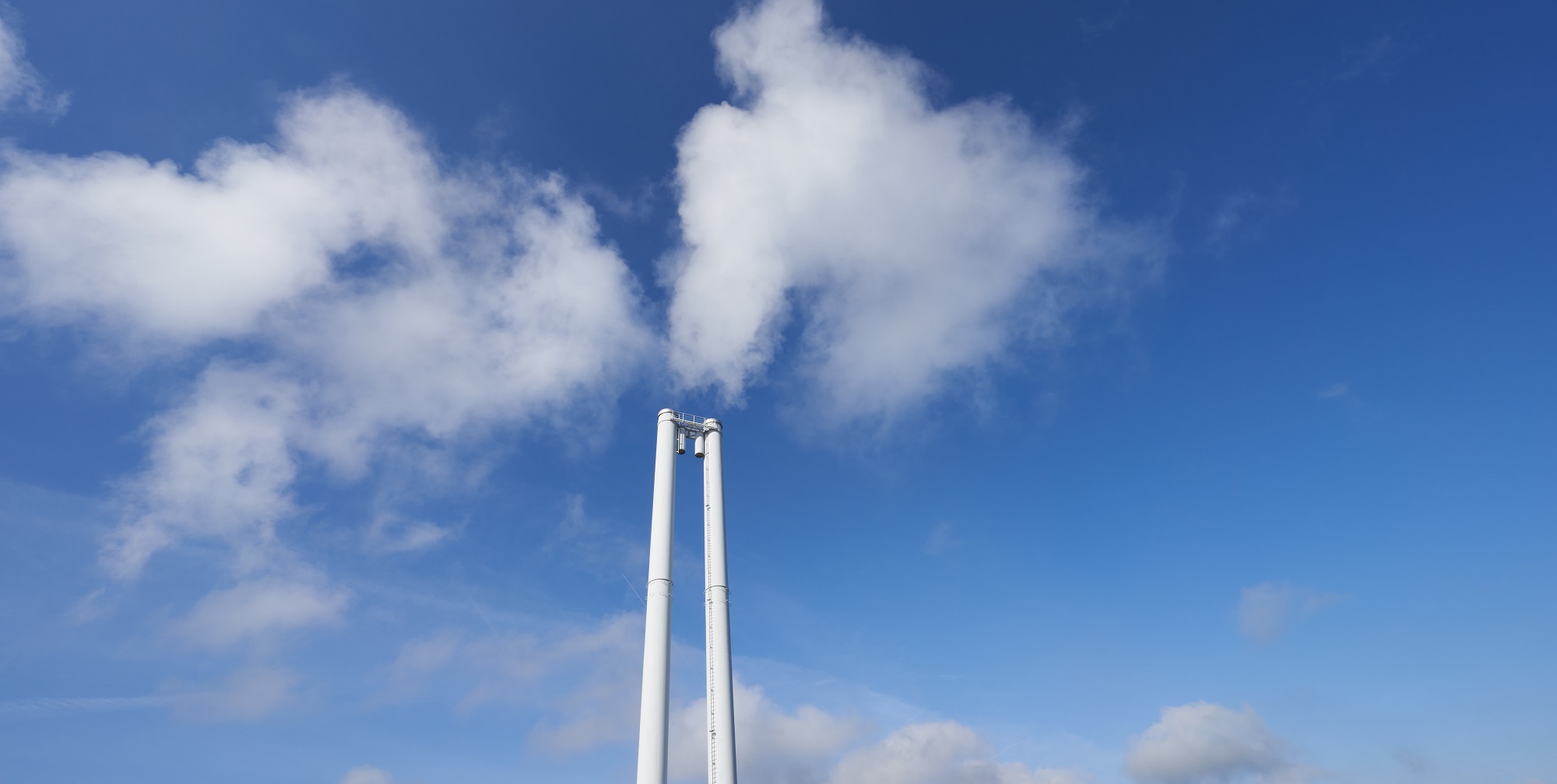Zwei hohe, weiße Windradtürme stehen vor einem strahlend blauen Himmel mit vereinzelten weißen Wolken. Ohne Flügel symbolisieren die Türme Innovation bei der Reduzierung von Emissionswerten und der Gestaltung einer saubereren Zukunft.